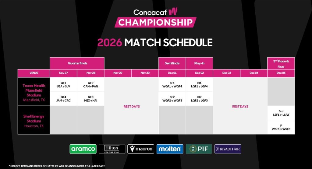Miami, FL – Concacaf ha anunciado que el Campeonato Concacaf W 2026 se disputará del 27 de noviembre al 5 de diciembre y tendrá como sedes el Texas Health Mansfield Stadium, en Mansfield, Texas, y el Shell Energy Stadium, en Houston, Texas.